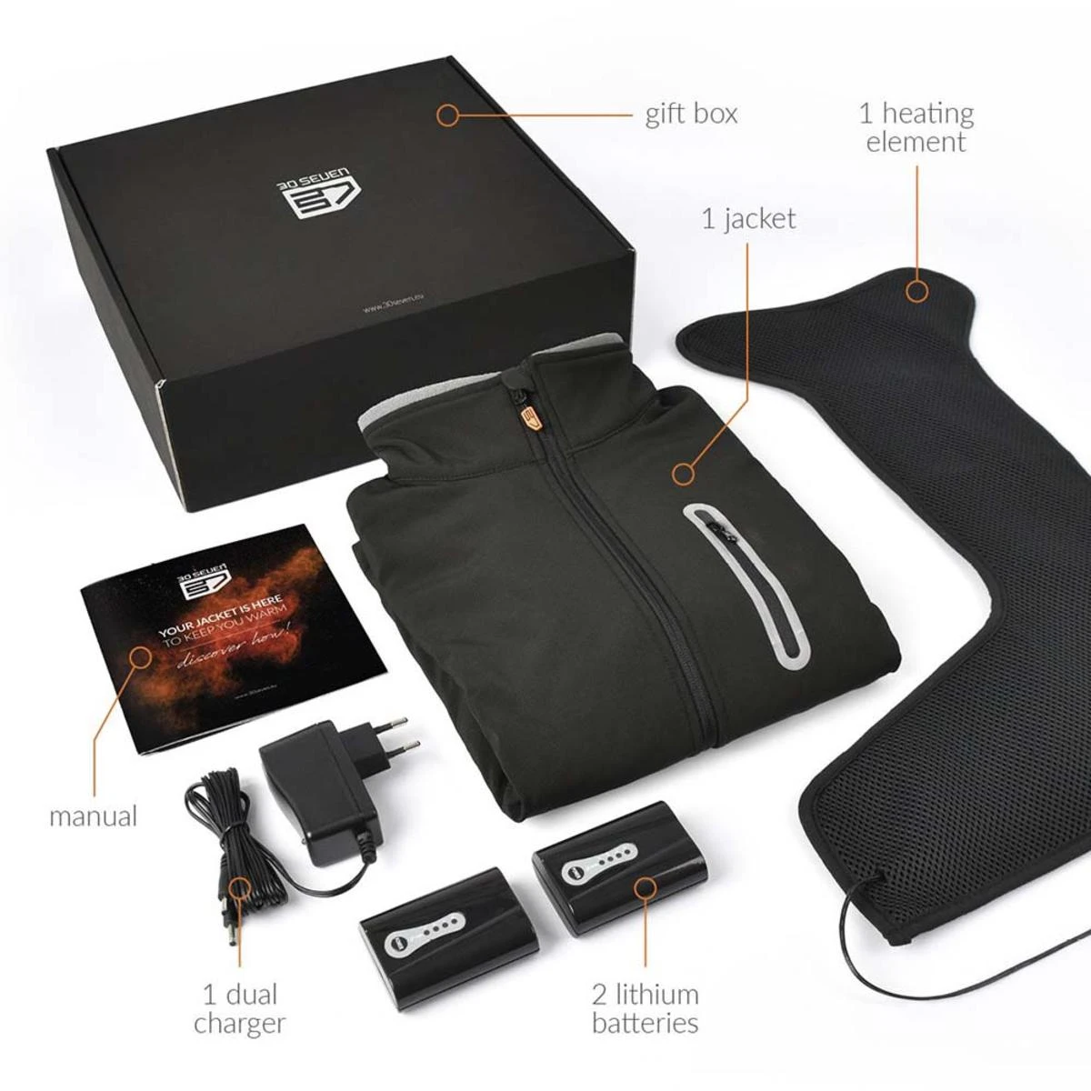The battery heated softshell jacket with rechargeable lithium-ion batteries keeps your neck, shoulders, kidneys and lower back warm for up to 7 hours. The softshell fabric makes the jacket both water-repellent and wind-resistant. Side armpit vents and air permeability make this jacket perfectly suitable for all outdoor sports, work and activities. Adjustable cuff tabs and an elastic drawstring at the bottom retain the warmth generated by the heating element. 30seven is the only brand that uses removable heating elements in jackets. This unique system and the battery holders in the 2 side zipper pockets make the system very user-friendly. You can use the same heating element for our other jackets and base layers.