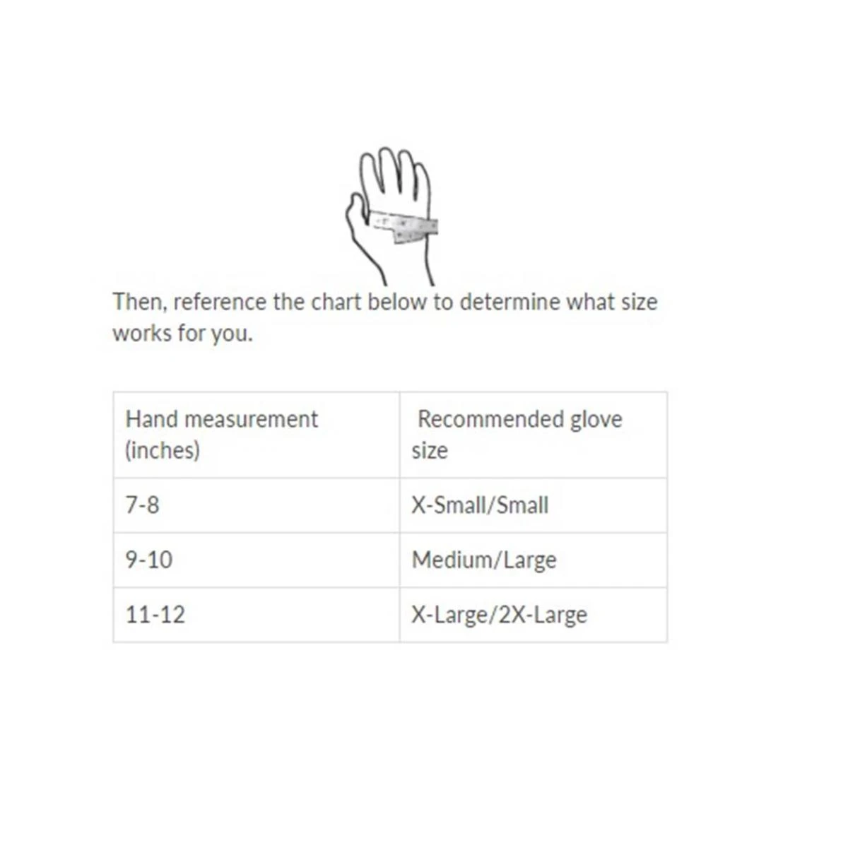 Choosing a size: Measure your hand in inches around the widest part, NOT including your thumb; usually, that’s just below your knuckles.