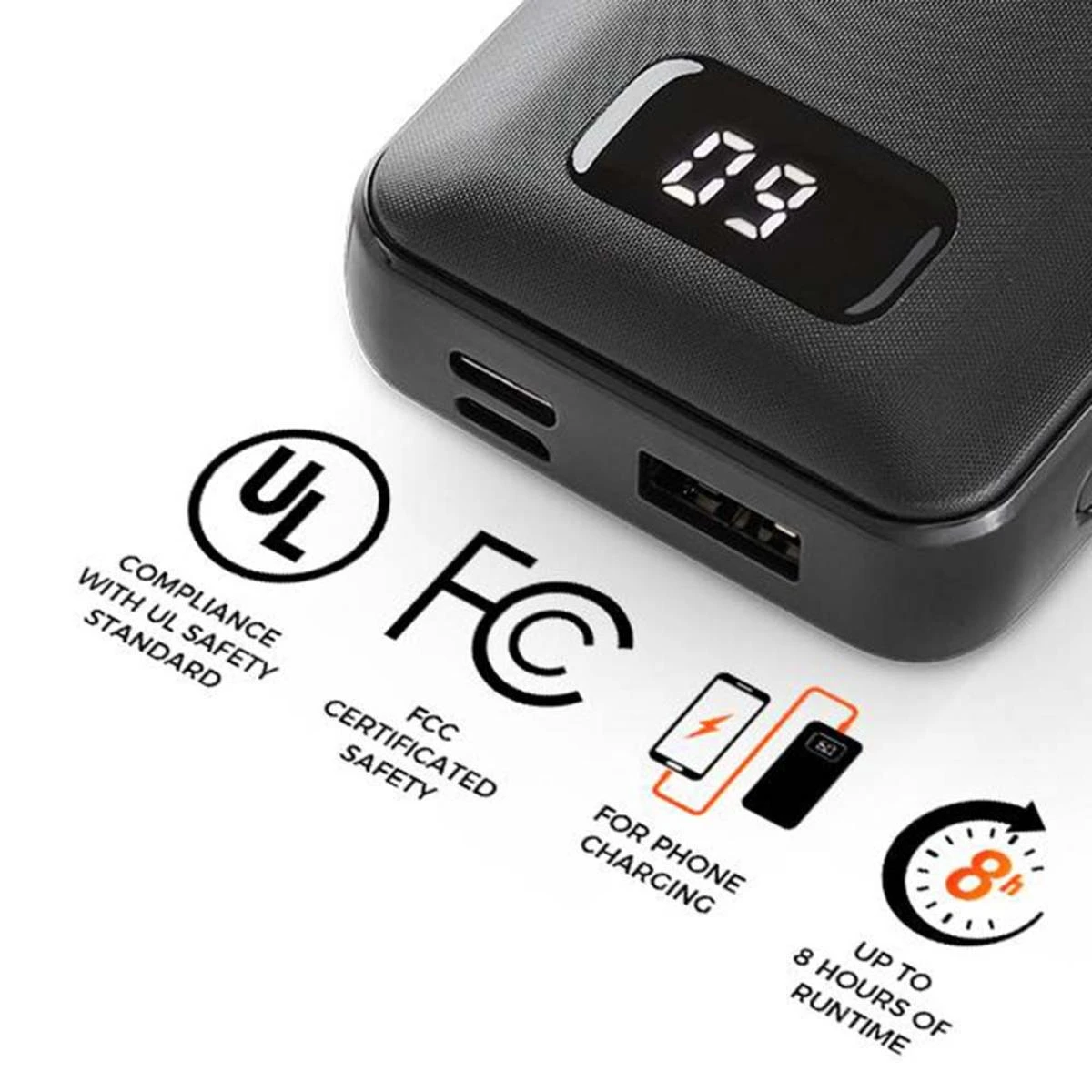 - 5V USB Lithium-Ion 9600mAh UL certificated battery, up to 8 working hours.