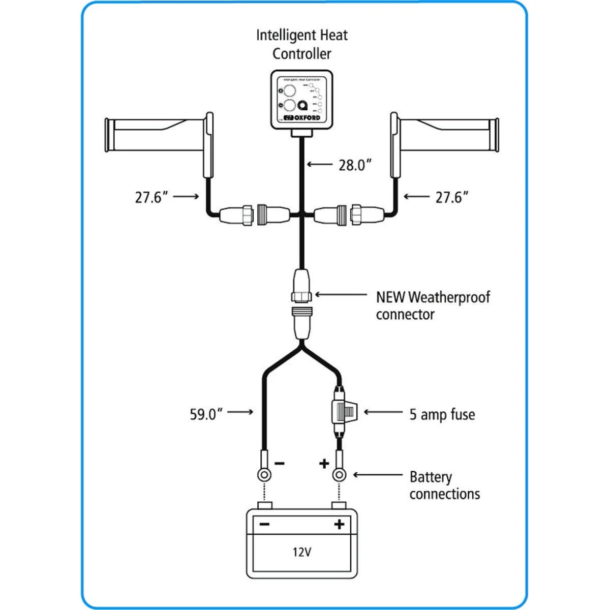 The Oxford Heaterz Premium Adventure heated handlebar grips are made especially for adventure bikes. The grips have ergonomically engineered surface structures to optimize riding performance. Thicker rubber in areas of maximum wear; rhombus tread patterns for high levels of grip and feel; diamond tread pattern where maximum grip is required. What really sets the Oxford Heaterz apart? The answer is many tried and tested features such as the silicon cables which provide flexibility in the coldest weathers and the winter grade wiring prevents cracking and short circuits; the bonded grip design has been in use for many years and is well proven; the grip compound and thermo plastic rubber construction is designed to absorb vibration making them extremely comfortable and durable, often outlasting standard grips and the silicone wires that come from the grip are angled to eliminate water ingress and resulting corrosion/ice damage and have special unique internal supports which are heat shrunk together to prevent damage if the wires are snagged. In addition, five carefully chosen heat settings allow the perfect temperature to be selected in All weathers and most importantly, the switch will switch off if the voltage drops to 10.5V to ensure that the battery is not damaged to the point that it cannot be recharged to full capacity. This latest Premium range is the result of over 30 years of research and development by engineers and motorcyclists, which are now easier than ever to fit due to the new intelligent heat controller eliminating any need to wire the positive to a live ignition feed; simply connect the 2 ring connectors to the battery. You’ll find everything supplied by Oxford to fit your Heaterz from a wiring loom with ring connectors to the battery with simple plug and play waterproof connectors to attach to the switch and grips, smart mounting bracket and switch right down to the glue and cable ties all neatly packaged in one box.